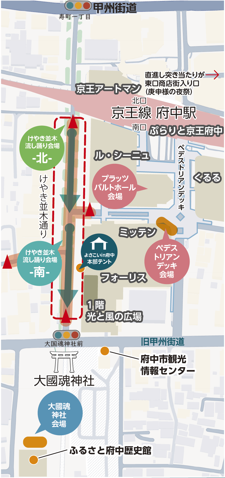 | 府中東口会場 | Y字路とスペース利用 ステージ8mX8m 定点踊り会場 |